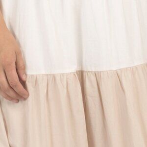 fully lined, tiered design, color block detail, back neck tie detail, cinched waist, fabric provides stretch