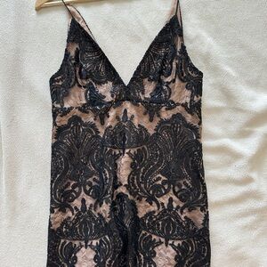 Chic backless dress with intricate black lace overlay. Cream underlay adds contrast. Ideal for evening wear. In perfect condition! So cute on! Perfect for the fall! #fall #cocktails #goingout #freepeople #bohodress #y2k #holidayparty #luxury