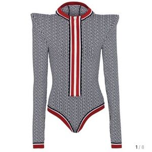 Chic Balmain bodysuit in black and white with bold red trim. Features a geometric pattern and high collar.size 36 EU