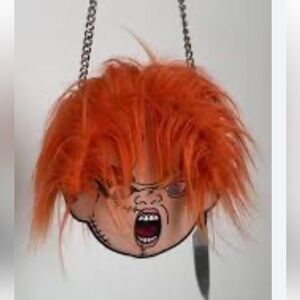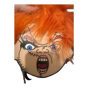 Unique Chucky two sided face character face bag. Bold orange hair. Eye-catching design. Perfect for statement Halloween look!