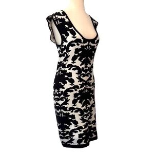 Keywords: Gianni Bini, GB, Black and White, B&W, Sheath Dress, Bodycon, Fitted, Knit Dress, Intarsia Knit, Graphic Print, Optical Illusion, Baroque, Damask, Scroll Pattern, Cap Sleeve, Crew Neck, Midi Length, Knee Length, Business Wear, Professional, Office Attire, Workwear, Cocktail Dress, Party Dress, Statement Dress, Large, Size L, Monochrome, Modern, Chic, Designer, Dillard's, Ponte Knit, Stretch Knit, Zipper Back, Winter, Fall, Spring, Timeless