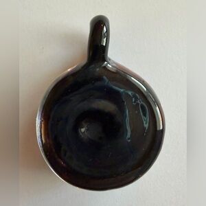This one-of-a-kind handcrafted pendant from WheatonArts features a stunning multicolor vortex swirl design with dimensional depth and vibrant movement. The glasswork displays layered waves of amber, blue, green, and smoky charcoal and frit tones, with a glowing iridescent center that shifts beautifully in the light. It would look gorgeous on a leather necklace or repurpose it as a Christmas tree ornament.