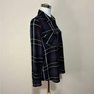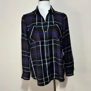L'AGENCE Denise Plaid with Back Sheer Black Silk Contrast Shirt. Size is medium and the pit to pit is 19.5” and the length is 26” and the sleeve length is 23”. Five button front closure with two chest pockets and single button cuff closure. The colours are black, brown, blue and white.