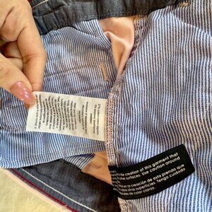 Soft blush-pink cotton-stretch chino shorts by Tommy Hilfiger, size 6. Tailored silhouette with classic preppy details — side pockets, back welt pockets, and striped interior waistband. Excellent pre-owned condition!