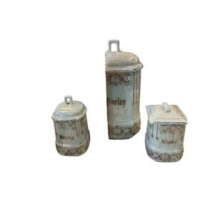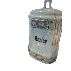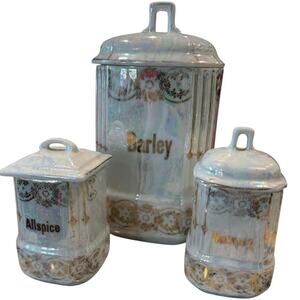 Antique Lusterware Canisters w/ Lid Germany Kitchen Barley Allspice Nutmeg Spice