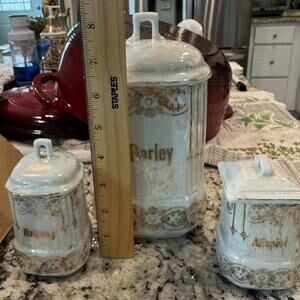 Presented here is a delicate opalescent antique kitchen canister set dating early 1900's from Bavaria. They are all marked on the bottoms. They are made of fine hard porcelain, the canisters or jars are white opalescent with gold pattern. The canisters are labeled in English Script. Being sold as is, in antique condition- which may include sm chips or discoloration etc.