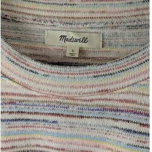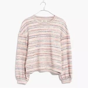 Madewell bubble-sleeve cropped sweater tee in a rainbow stripe on creamy oatmeal knit, size Large. Lightweight, soft, and drapey with an easy, boxy shape that hits right at the waistband of high-rise denim or skirts. Looks like a sweater, feels like your favorite broken-in tee.