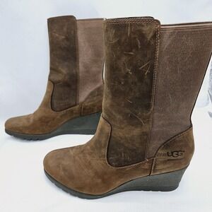 UGG Australia Coraline Boot Size 8.5 Wedge Heel Brown Leather Waterproof 1095133