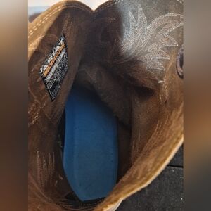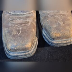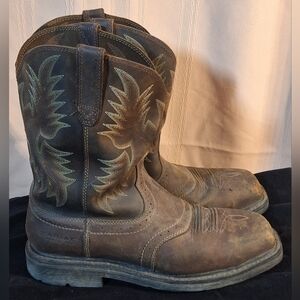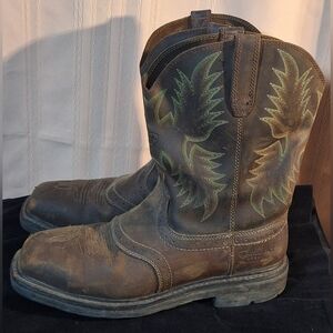Rugged Ariat boots with intricate stitching. Distressed brown leather for a vintage look. Ideal for western wear.