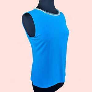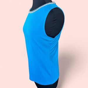 The blue color pops against any skin tone, while the sleek sleeveless cut and back keyhole button closure offer a tailored yet feminine silhouette.