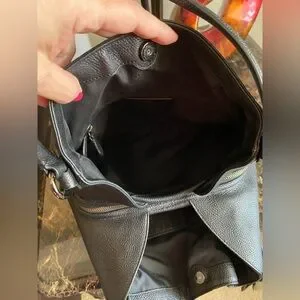 This elegant Coach hobo bag in black leather features intricate whipstitch detailing, offering a touch of sophistication. Its spacious design and curved top handle make it a versatile accessory for any occasion.