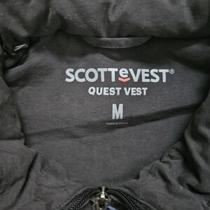 Stylish black vest by Scottevest. Features multiple pockets. Ideal for travel and everyday use.