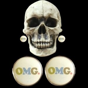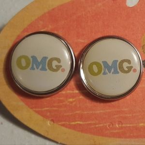 Cream silver snarky acronym OMG graphics Handmade round stud earrings NWT