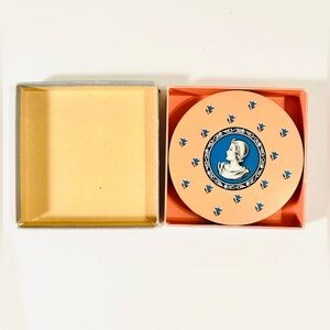 They are 3” round, and are in their original box that is 3 1/4” square. The back of the cards are a pink color with blue tulip like flowers, in the center is a 20’s woman’s bust on a blue background, surrounded by a black border with white swirls. All cards are in box. The cards and box are in nice condition. I don’t think the cards have been used.