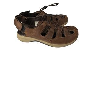 The Tideriser Luna Fisherman Leather sandal features full grain leather uppers and a rubber outsole for grip and traction for performance from the trail to town. FEATURES Full grain leather upper Lycra lining for padded comfort Adjustable heel hook and loop closure for easy on and off Bungee closure system for added adjustability Leather wrapped EVA foam insole Molded nylon arch shank Compression molded EVA midsole for stability and comfort Merrell air cushion in the heel absorbs shock and adds stability Rubber outsole for traction and durability Weight: 1lb 8oz / 680g. Slightly used wear as shown in the photos. We ship the same day or the next business day. Feel free to ask questions.