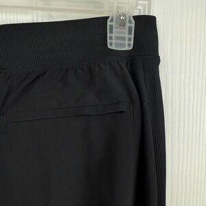 Athleta women's black stretch Brooklyn-style travel/commuter pants in size 6. Designed with a sleek pull-on waistband, front pockets, zip pocket detail, ribbed stretch side panels, and a polished straight-to-slim leg. Made for all-day comfort with Athleta's lightweight, quick-drying, wrinkle-resistant fabric—perfect for work, travel, commuting, and athleisure outfits.