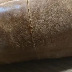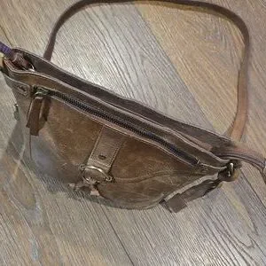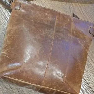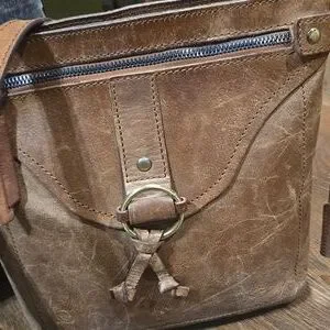 Brown 100% genuine leather crossbody... adjustable shoulder strap.. top zipper closure.. front outer zipper pocket.. fully lined.. inside zipper pocket.. inside slip pockets.. front metal ring embellishment..
