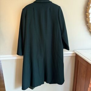 Color is a true dark hunter green (some photos appear lighter). Soft wool, great drape, and a very flattering long silhouette.