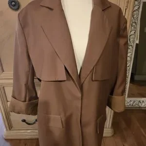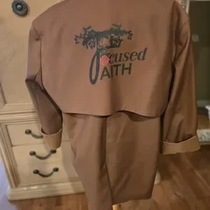 Stylish brown jacket with faith based wording on the back of the jacket. Medium runs large. Jacket has belt loops can style with belt of your choosing.