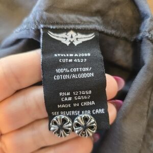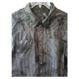 Affliction black and gray tie dye long sleeve button down shirt. Embroidered cross graphic on front and back. Roll tab sleeves, silvertone metal buttons. Front chest pockets. Excellent used condition.