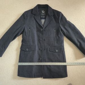 Wool blend button up coat with padded lining. Very warm! Excellent condition.