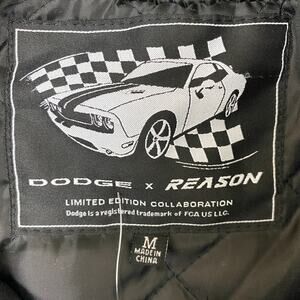 Stand out with this rare Dodge x Reason collaboration jacket featuring bold graphic and a premium varsity bomber silhouette. This limited-edition piece celebrates Dodge heritage with flame graphics, racing details, and iconic muscle-car inspired artwork,