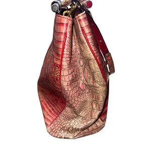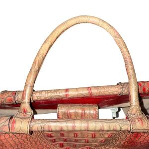 Own a piece of sophisticated artistry with this Brahmin satchel, a testament to exquisite craftsmanship and bold style. The rich, deep red hue, intricately embossed to mimic genuine crocodile, captivates the eye, while subtle tan undertones add refined elegance. Its generous silhouette promises ample space for all your essentials.