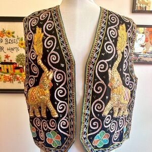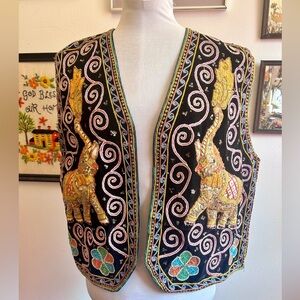 Amazing vintage embroidered and sequinned cotton velvet elephant vest made by Karma Kreations. A perfect hippie style vest that emulates 60s and 70s counterculture style. Made in Thailand. The level of detail on this piece is incredible! In excellent condition.