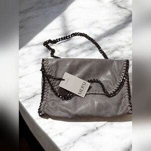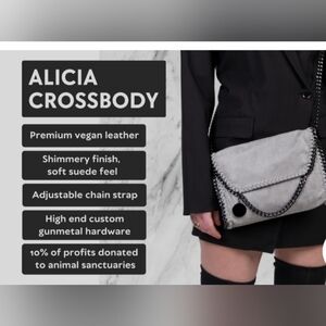 Mersi Alicia Crossbody bag. Can be worn 3 ways. Premium Vegan leather, shimmer finish, soft suede feel. High end custom gunmetal hardware