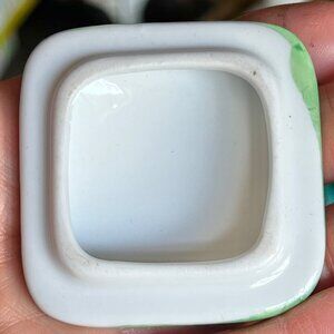 This elegantly designed trinket box features a delicate green rose pattern, crafted exclusively for Oscar De La Renta Parfums. Its compact size makes it ideal for storing small jewelry pieces or cherished keepsakes. The ceramic material ensures durability while adding a touch of sophistication.