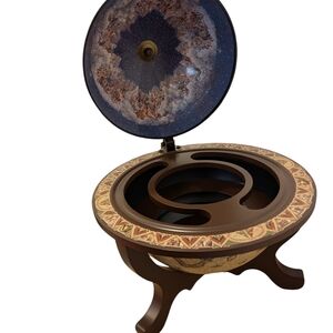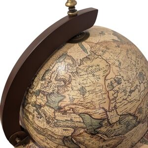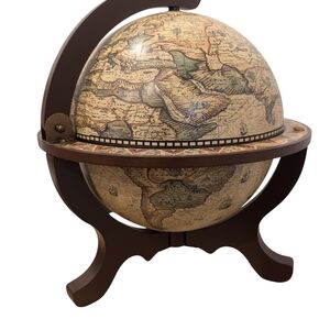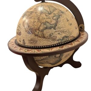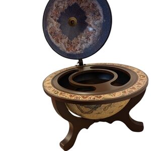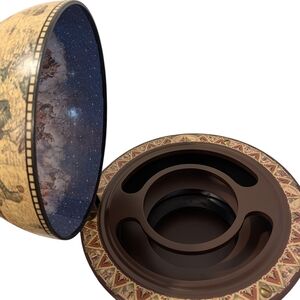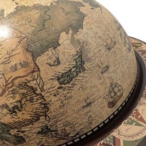 This beautiful tabletop globe bar is both a functional piece and a striking décor/display item. The exterior features an old-world style map with intricate illustrations, sailing ships, and warm antique tones—perfect for anyone who loves classic, dark academia-inspired décor.