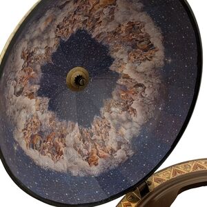 Lift the top and you’ll find an absolutely stunning interior: a celestial mural filled with rich colours, mythological figures, and a star-studded sky. The inner tray is designed to hold bottles and glasses securely, making it a charming mini bar or display piece.