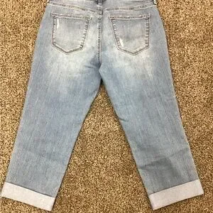 Stylish ankle-length jeans. Light blue wash with subtle distressing. Excellent condition. All distressing was on the capris when purchased.