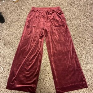 Luxurious velvet wide-leg pants in a rich burgundy color. Perfect for a stylish and comfortable look.