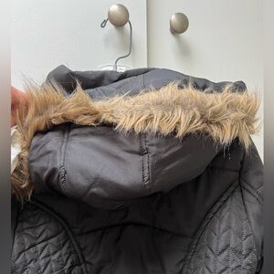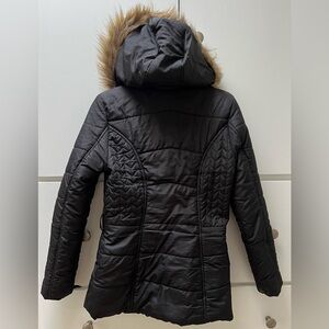 Rampage winter coat with removable fake fur edged hood in size small. Zipper front closure. Hood zips in and out. Two front pockets. In excellent condition but missing belt.
