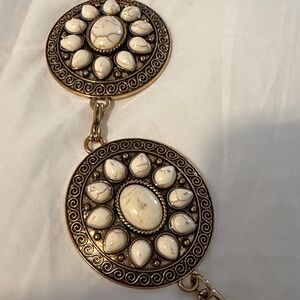 Elegant belt with gold chain and cream accents. Features circular medallions with intricate design.