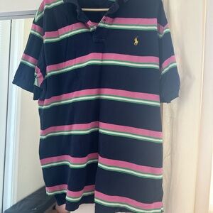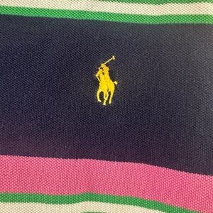 Stylish Ralph Lauren polo with bold stripes. Features navy, pink, and green colors. Perfect unisex shirt, on trend and in great condition!! This one wont last long!