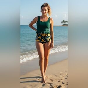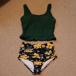 Green Ruffle Bikini Top with Floral High-Waisted Full Coverage Bottoms NWOT