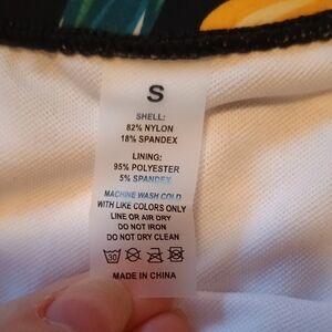 Stylish green ruffle bikini top (size M) paired with floral high-waisted bottoms (size S). Features vibrant yellow flowers on a black background..