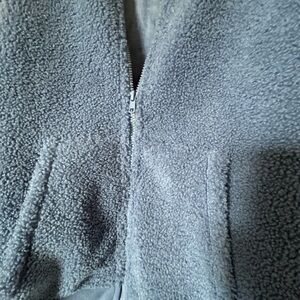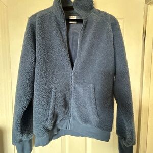 Soft light blue fleece jacket. Ideal for cool weather. Comfortable and versatile.