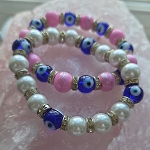 Charming bracelet set with pink and blue evil eye beads. Accented with pearl-like beads and gold-tone spacers. Perfect for adding a touch of protection and style.