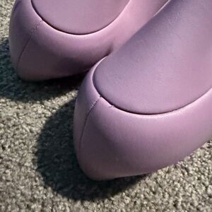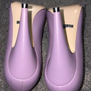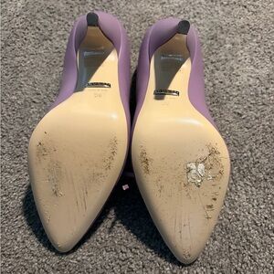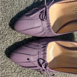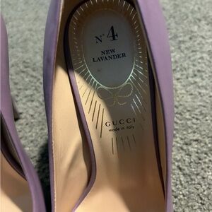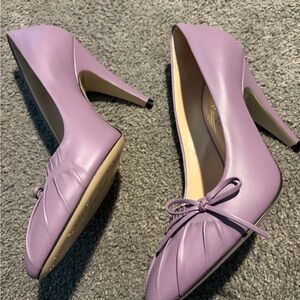 Chic lavender heels by Gucci. Features elegant bow detail. Ideal for stylish outings. Worn only once fantastic shape except for small indentation on back of right heel. Have original box, two shoe bags and spare heel taps included