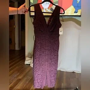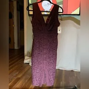Step out in style with this elegant lined, lace, sleeveless dress. This above the knee mini and geometric trim with a peekaboo hemline with alluring front slit completes the updated look to add a modern note to a classic lace sheath dress that's ready for date nights and cocktail parties and is perfect for any occasion. This purple dress offers a flattering fit and timeless design size 2 - XS. NWT