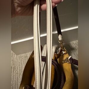 Gorgeous Coach shoulder bag in white with brown handles and mustard colored suede inside. Features gold hardware. Ideal for everyday use.