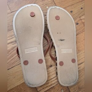 Leopard print flip flops with stylish tan thong straps.