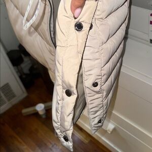 Elegant and cozy puffer coat. Features a sleek design with a hood. Perfect for chilly days. The length of the coat is a tap bit below the the waist and a bit above the thigh. The coat is a size large and definitely keeps you very warm! It has a re-attachable hoodie. And also the sides is also adjustable with buttons. Still in good condition, only worn it once!