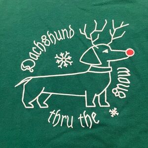 This playful green tee features a charming reindeer dachshund print, perfect for adding fun to any outfit.