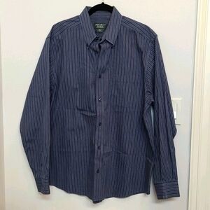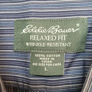 Eddie Bauer Size L Relaxed Fit Wrinkle Resistant Blue Striped Button Shirt. 100% Cotton.