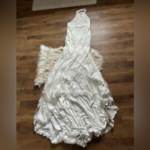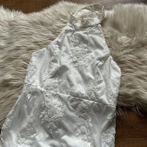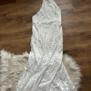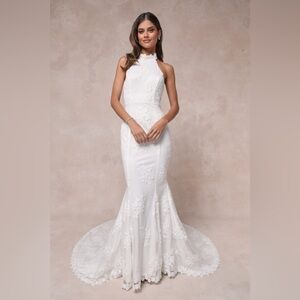 LULU’S Dreamy Glamour White Embroidered Halter Mermaid Maxi Dress