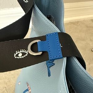 Min and Mon Vincent blue bucket bag featuring colorful embroidered mushrooms.
